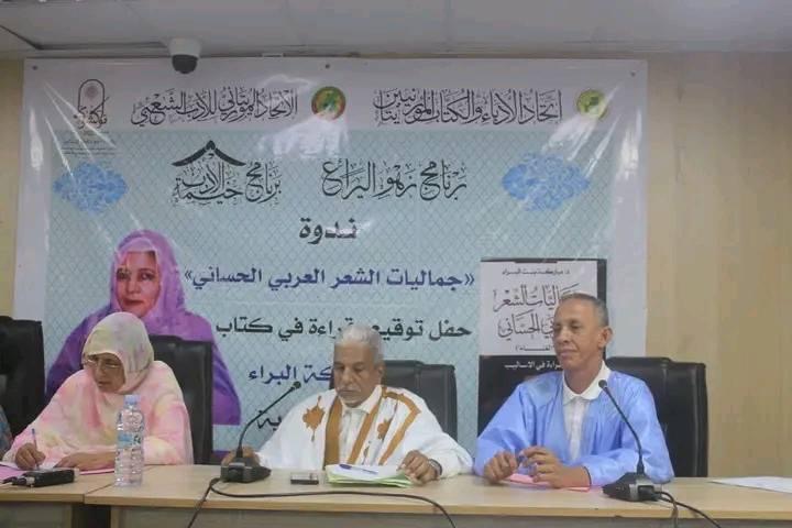 نظم اتحاد الأدباء والكتاب الموريتانيين والاتحاد الموريتاني للأدب الشعبي الأربعاء 2 اغسطس 2023 ندوة أدبية  تحت عنوان جماليات الشعر العربي الحساني بقاعة العروض بجهة انواكشوط ، حيث كُرست الندوة لتوقيع وقراءة كتاب جديد في المجال للدكتورة الشاعرة باته بنت البراء.