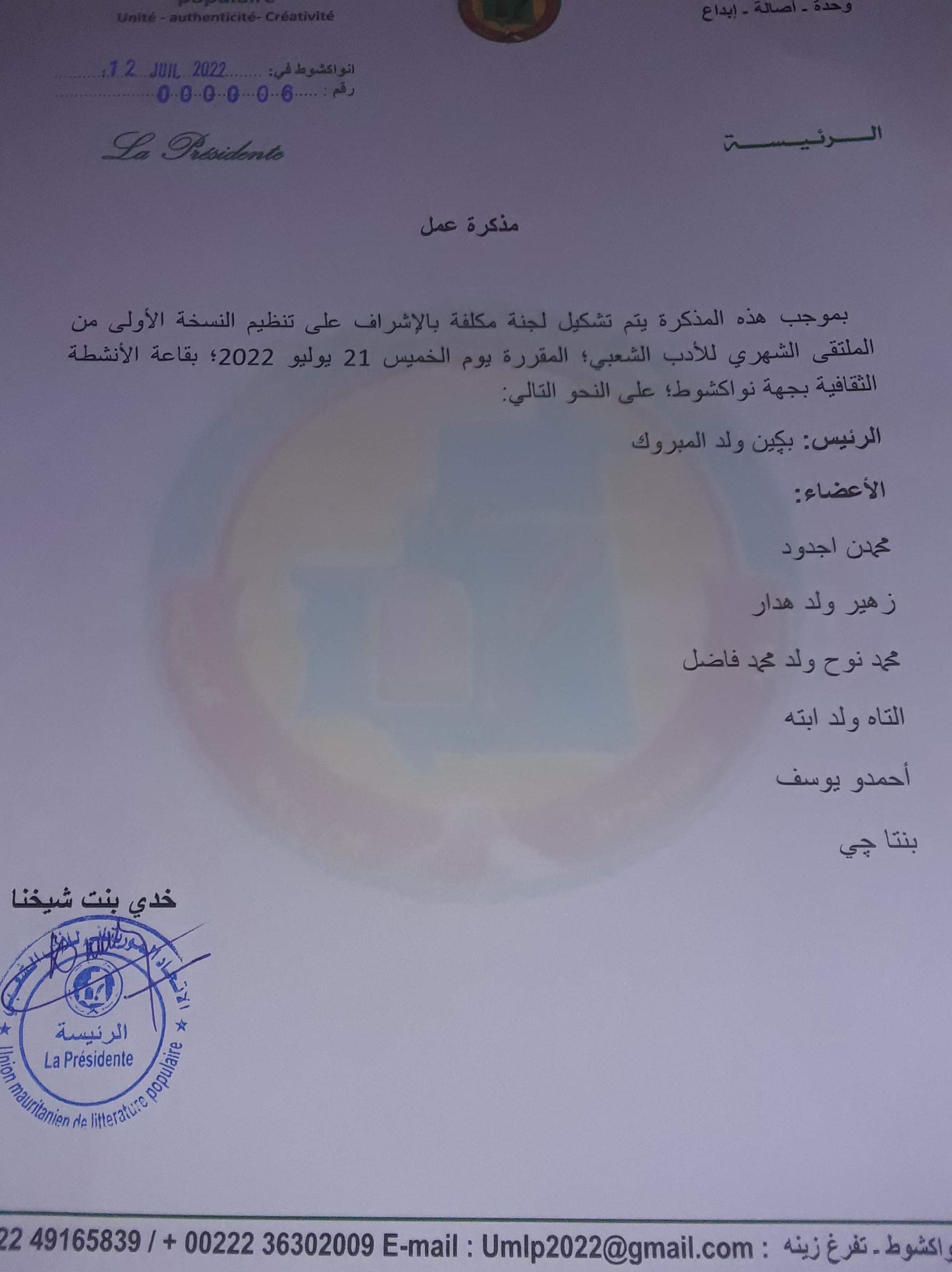 عينت رئيسة الاتحاد لجنة للإشراف على نشاط الملتقى الشهري الأول برئاسة الأديب بكين ولد المبروك وبعضوية كل من: